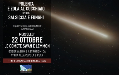 Mercoledì 22 ottobre abbiamo organizzato una speciale serata con cena per osservare due comete scoperte quest'anno che sono visibili con un binocolo o un piccolo telescopio: la Lemmon e la SWAN. Non sono comete visibili ad occhio nudo ma sono comunque tra le più brillanti dell'anno e vale la pena tentare di osservarle! Informazioni al link. -