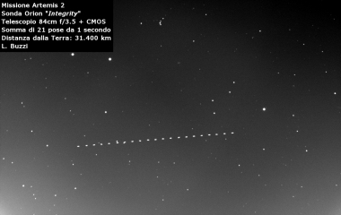 Dopo 27 ore dal lancio siamo riusciti a fotografare la capsula Orion in rotta verso la Luna. La missione avrà una durata di 10 giorni ed i 4 membri dell'equipaggio circumnavigheranno la Luna ad una distanza di circa 6500km.
