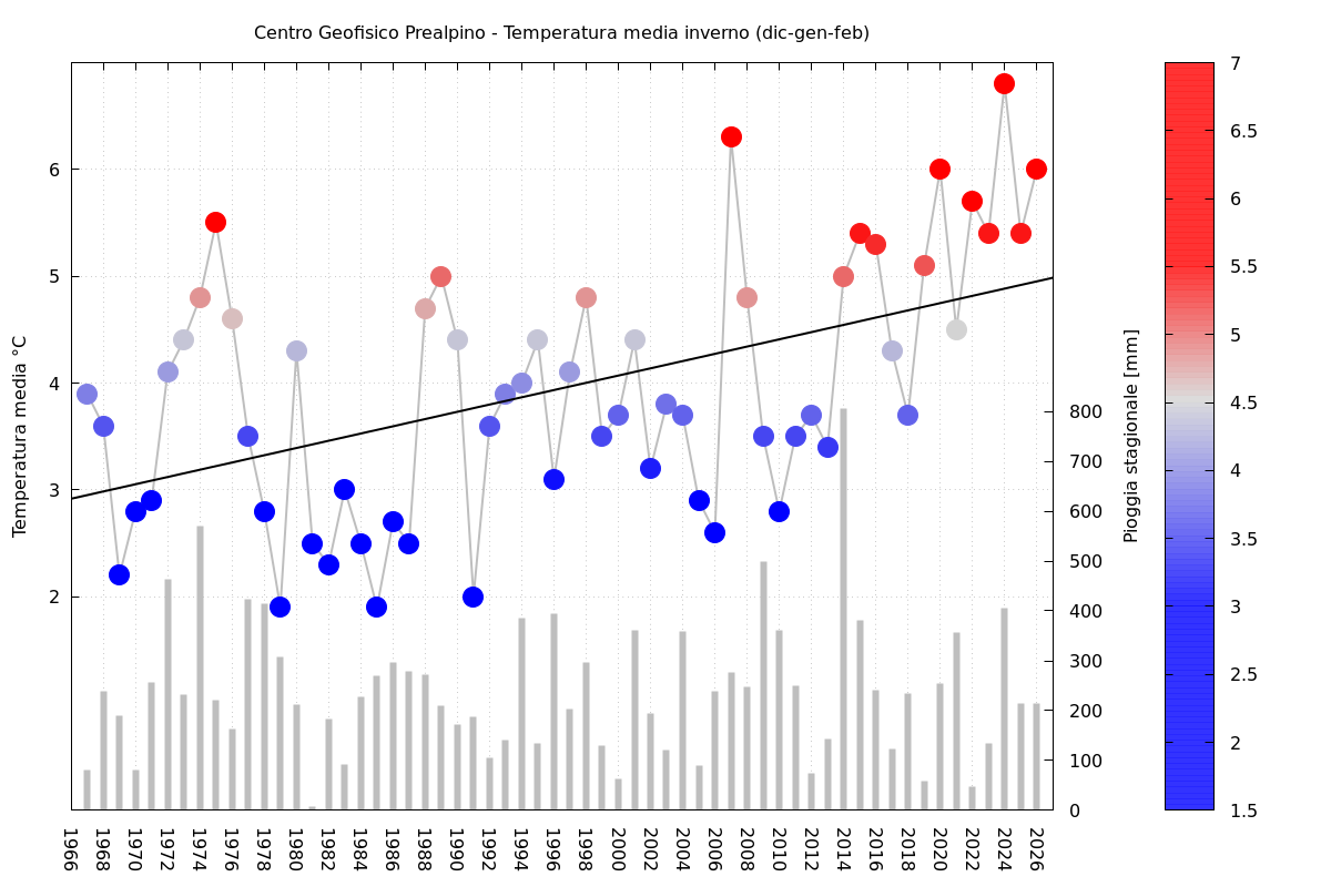 Nel suo complesso l'inverno 2025/26 è stato il terzo più caldo a pari merito con il 2020, con temperatura media di 6°C mentre più caldi furono il 2024 (6.8°C)