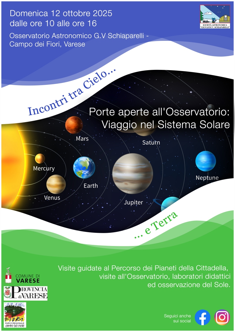 Domenica 12 ottobre abbiamo organizzato l'ultima giornata di Porte Aperte all'Osservatorio del 2025, a tema "Sistema Solare". Dal cancello d'ingresso faremo visite guidate al percorso dei pianeti ogni 30 minuti (dalle 10 alle 15), poi visite all'Osservatorio, laboratori didattici ed osservazione del Sole. Ingresso libero e gratuito. -