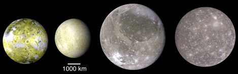 In questa foto vengono confrontate le dimensioni dei quattro satelliti galileiani di Giove. Da sinistra a destra: Io, Europa, Ganimede e Callisto. Il secondo, Europa, ha un diametro di 3.138 Km ed è leggermente più piccolo della nostra luna. Il satellite Io è noto per la sua violenta attività vulcanica. Gli altri tre sono caratterizzati da una composizione chimica ricca in ghiaccio d'acqua.