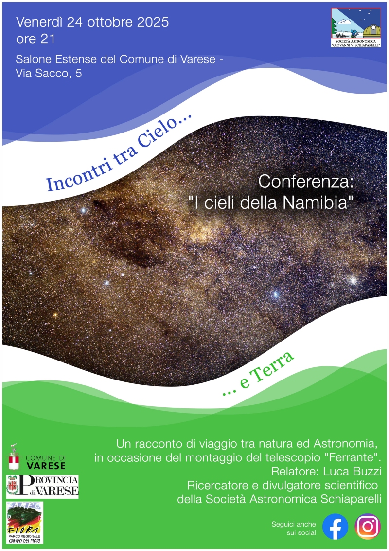 Venerdì 24/10 alle ore 21 presso il Salone Estense di Varese il divulgatore scientifico Luca Buzzi parlerà dei cieli della Namibia, dove è installato un nostro telescopio per l'osservazione del cielo, donato da Piergiorgio Ferrante. Osservare il cielo stellato è un privilegio, e solo trovandosi in mezzo alla natura, lontani dalle città ci si rende conto di quanto l'inquinamento luminoso ci abbia privato della nostra naturale connessione con le stelle. -