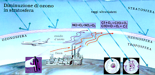Come mostra la figura 1, i gas inquinanti prodotti dall'uomo, tra i quali soprattutto il Freon (propellente per le bombolette spray con formula CFCl3 o CF2Cl2) e l'ossido di azoto (NO) prodotto dai motori degli aerei si propagano nella stratosfera e favoriscono la diminuzione dell'ozono. Si producono i famosi "BUCHI NELL'OZONO" dei quali ogni tanto si sente parlare.