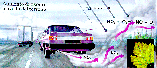 Figura 2: meccanismo di formazione dello smog fotochimico. L'NO della combustione produce NO 2 che con forte irraggiamento solare produce ossigeno libero e quindi ozono. Biossido di azoto e ozono sono tossici per l'uomo e la vegetazione