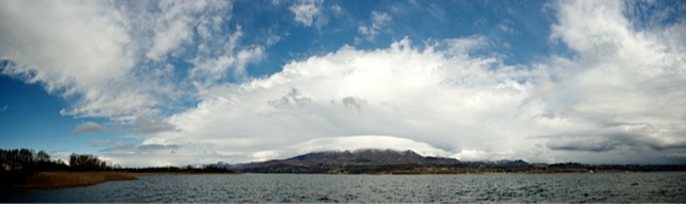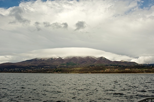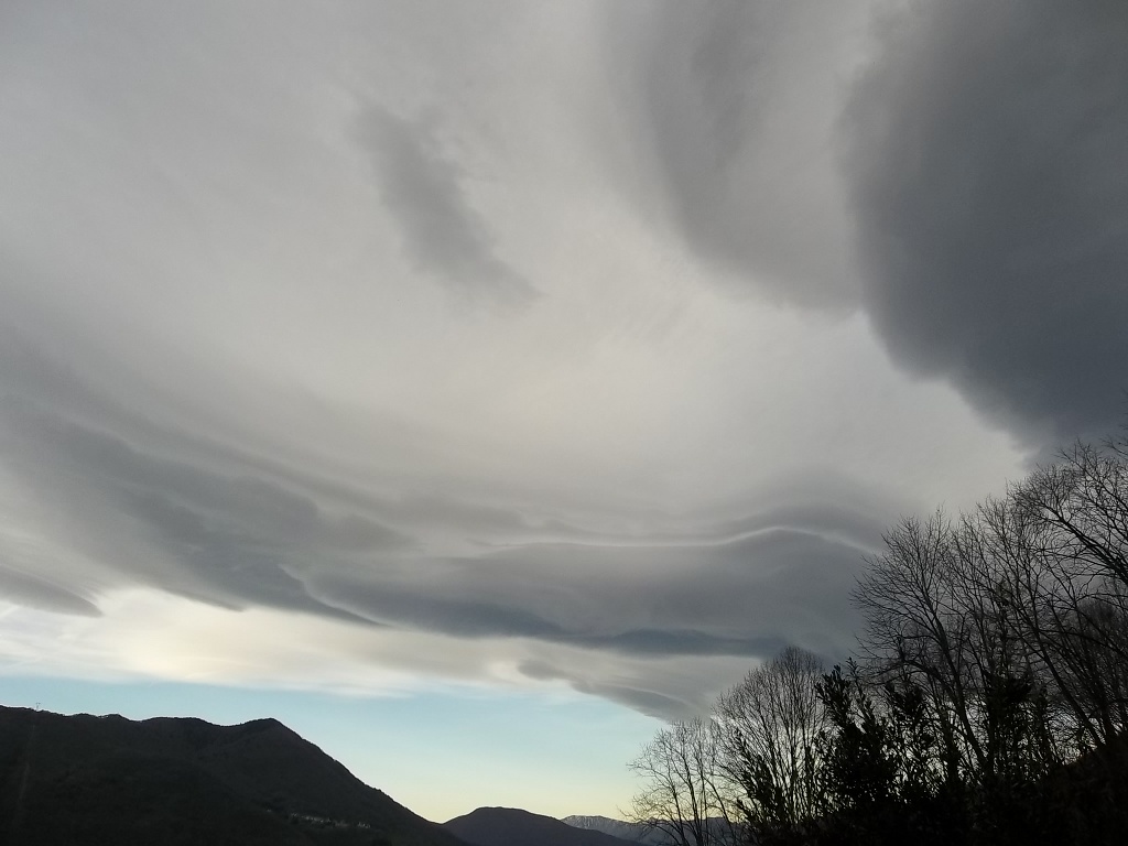 Nel pomeriggio del giorno 19 il vento da Nord porta il sereno e forma un cappuccio (altocumulo lenticolare) sopra il Campo dei Fiori, imbiancato dalla recente nevicata. (foto M. Del Romano - Osservatorio Astronomico Campo dei Fiori).