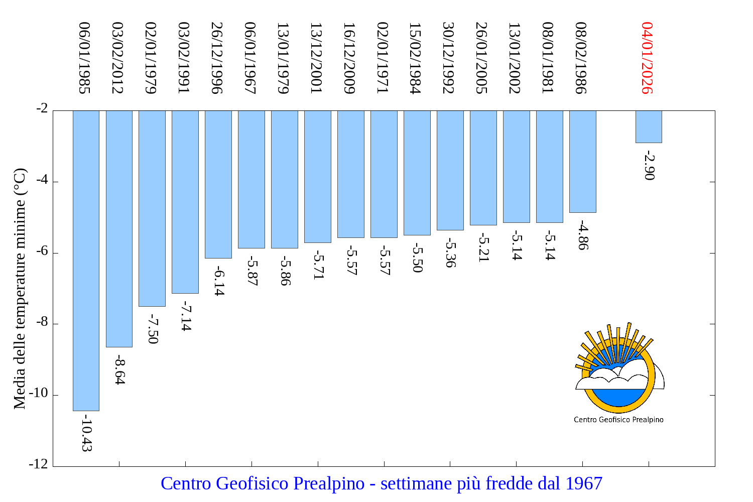 Al primo posto troviamo la settimana iniziata il 6 gennaio 1985 con una media delle temperature minime dei 7 giorni pari a -10-4°C.